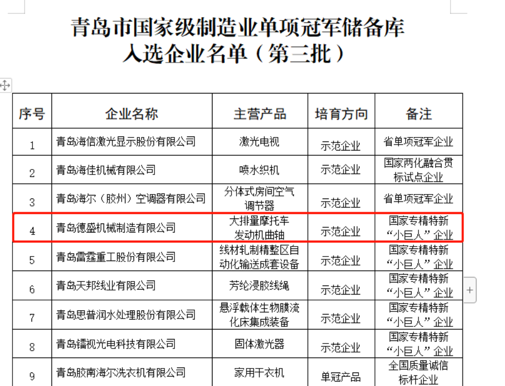 2、近日,青島市工業(yè)和信息化局公布了入選青島市國(guó)家級(jí)制造業(yè)單項(xiàng)冠軍儲(chǔ)備庫(kù)企業(yè)名單(第三批),我公司成功入選。